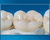 Auf ein Metallgerüst werden die Ihrer Zahnfarbe entsprechenden keramischen Massen zur natürlichen Zahnform aufgebrannt. Dies geschieht in mehreren Prozessschritten. Wir verwenden dabei vorrangig hochgoldhaltiges Metall nach den „all-for-one" Produktlinien, welches auch für andere Techniken verwendet werden kann. Die Härte, Opazität (Lichtdurchlässigkeit) und Farbwahl der von uns verwendeten Keramikmassen entspricht der des natürlichen Zahnschmelzes. Um Funktionsstörungen weitgehend auszuschließen, arbeiten wir nach einem biomechanischen Kauflächenkonzept sowohl in Keramik als auch in Gold.